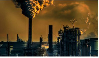 Pollution of the air, water and soil caused by toxins such as plastics, heavy metals and nitrates, caused by factors such as toxins and gases released by factories, combustion of fossil fuels, acid rain, oil spill and industrial waste.